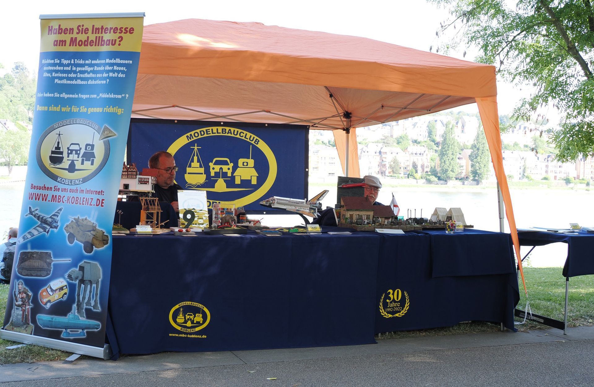 Auch wir, der Modellbauclub Koblenz, waren mit drei Kollegen und einem Präsentationsstand vor Ort. Es wurden einige fertige Modelle und Dioramen aus der Kaiserzeit gezeigt und die Besucher konnten den Kollegen beim Basteln über die Schulter sehen.