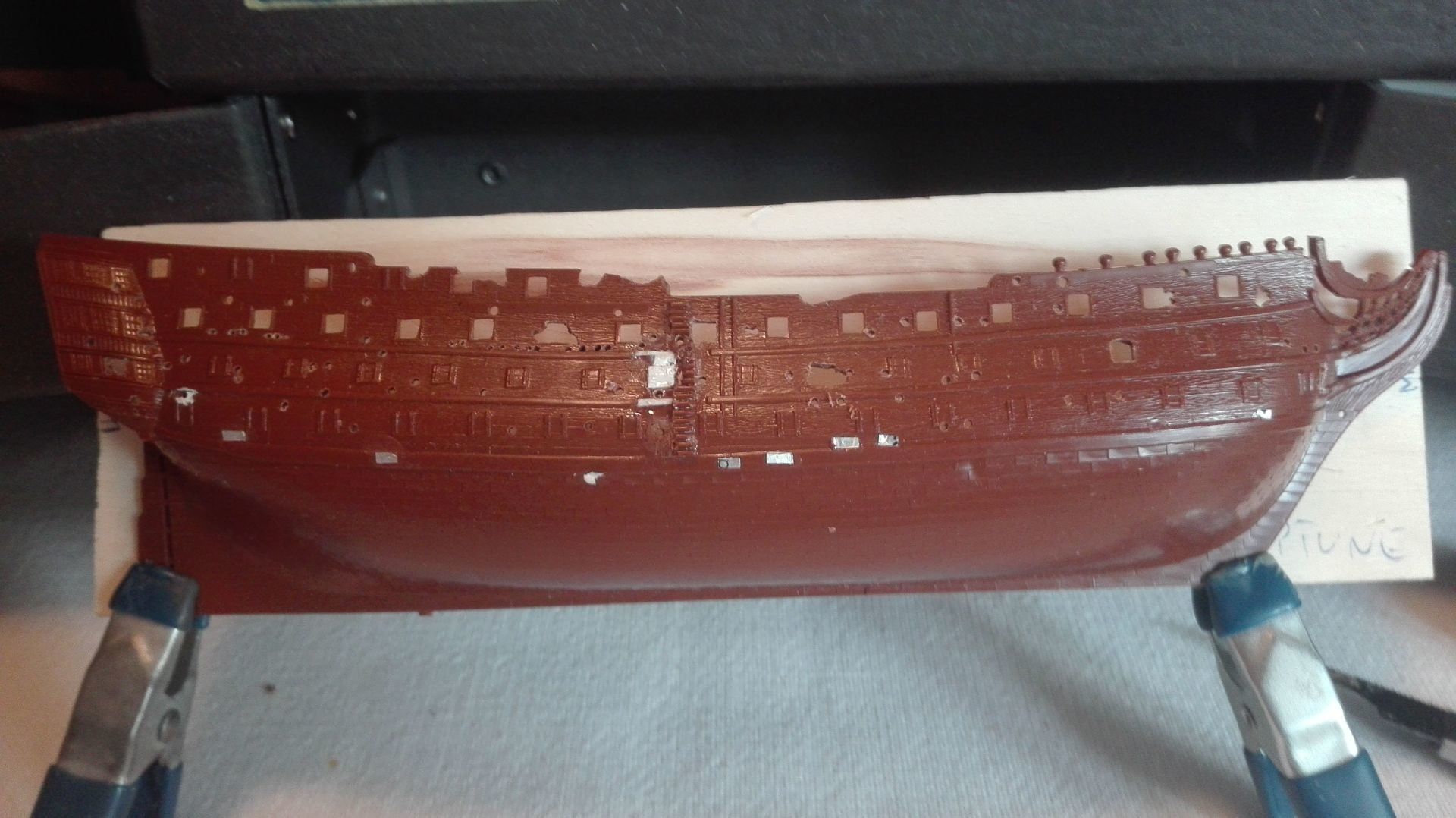 Die Neptune lief 1797 vom Stapel. Mit 98 Kanonen auf drei Decks wird sie mit ihren „Schwesterschiffen“ Dreadnought und Temeraire als Linienschiff zweiten Ranges eingestuft. Die wesentlichen Unterschiede zur Victory sind natürlich die Galionsfigur als auffälligstes Merkmal, die Gestaltung der Seitenansicht mit etwas höherer Back, nur einer schmalen Außentreppe ohne Pforte im Batteriedeck und daneben ein Bootsfender. Die Seitentaschen am Heck sind stärker geneigt als bei der Victory und gehen auf Höhe der Poop in eine oben offene Achtergalerie über. Manche Darstellung der Neptune zeigt auch zwei offene Galerien.