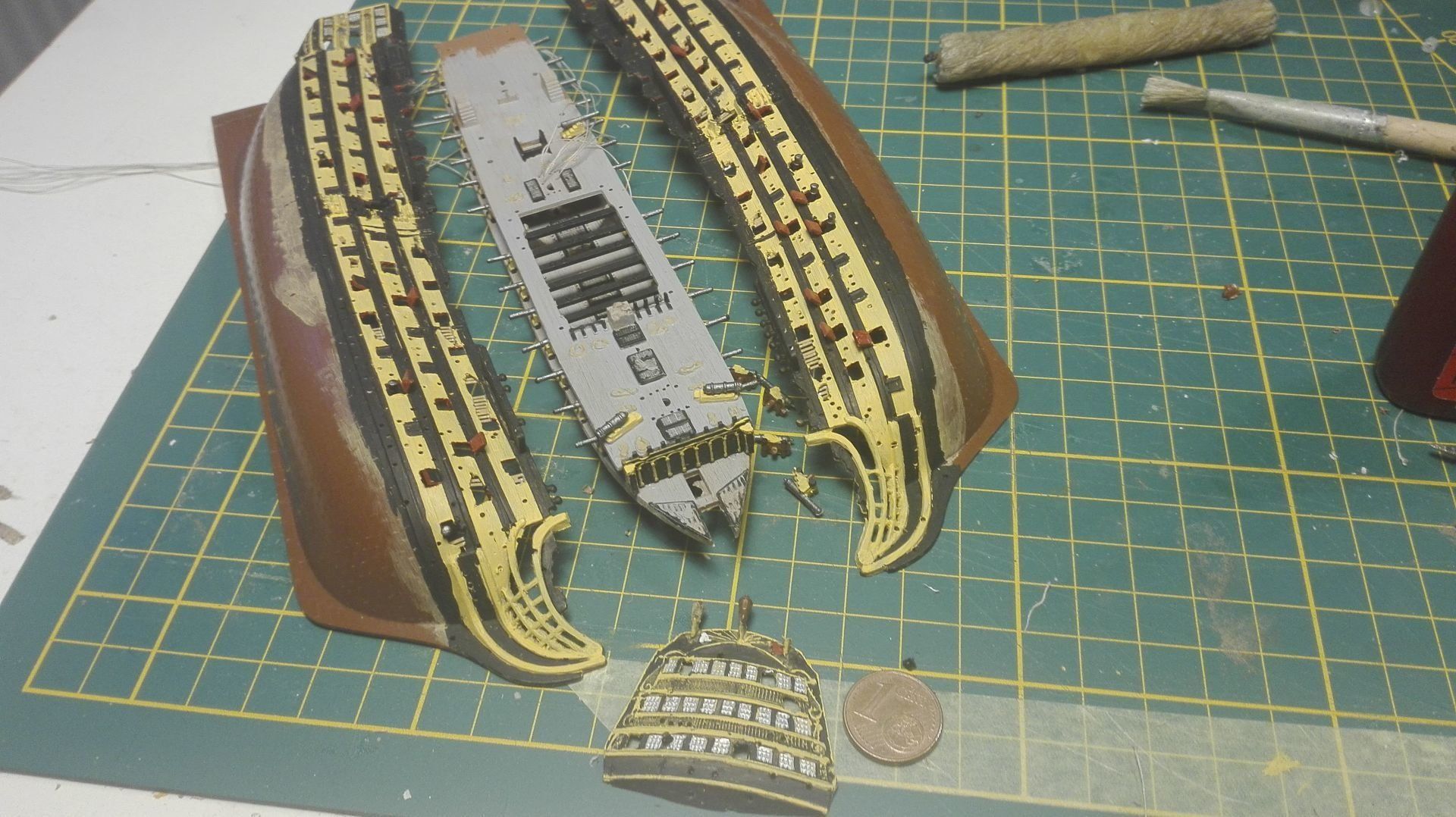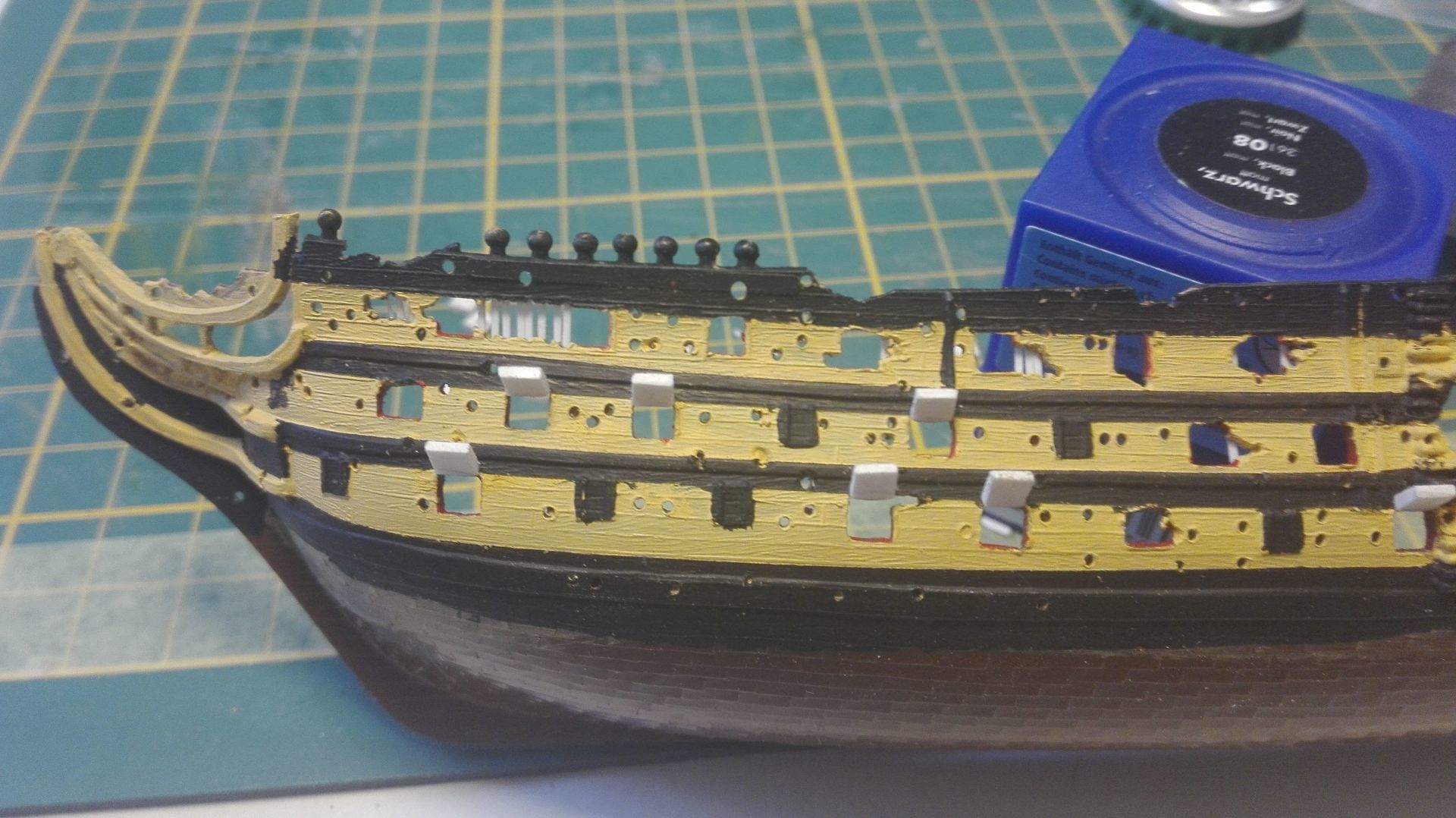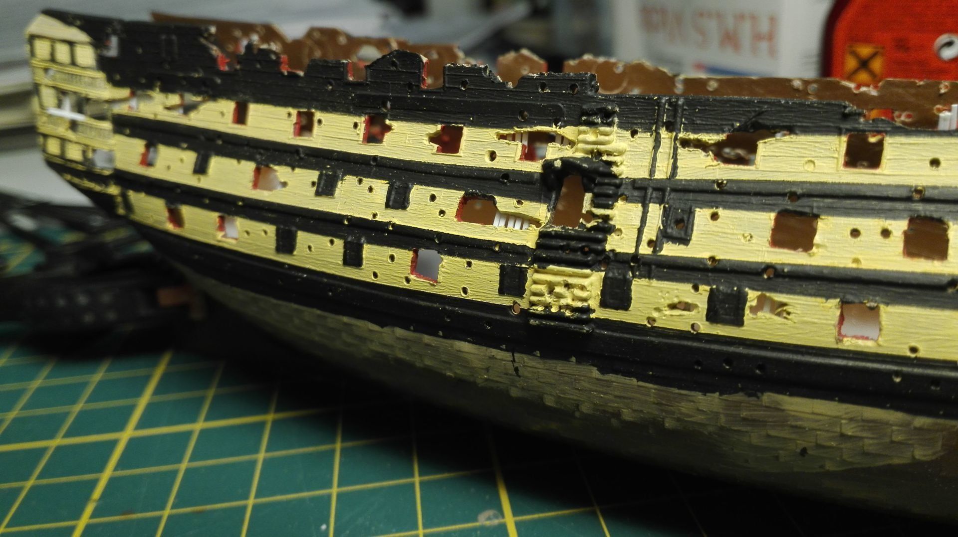 Die erste Grundfarbe (ich nutzte ausschließlich REVELL-AQUA-Farben) wurde jetzt aufgebracht, ein helles beige (Bild 3), gefolgt von Gelb für die Pfortenstreifen und dem Schwarz für den Rest (Bild 4 und 5). Dabei hatte ich die Ergebnisse der Restauratoren der Victory im Sinn – dieser Ockerton, der je nach Licht plüschig-rosa erscheint. Möglicherweise hat die „Trafalgarfarbschicht“ auf der Vic jetzt diesen Farbton, damals sah er sicher anders aus. Ich frage mich, ob die Restauratoren alle auf eine Farbschicht einwirkenden Parameter bei ihrer Rekonstrukion berücksichtigt haben, so auch die Reaktion der „Nelsonfarbe“ mit dem Untergrund und der nachfolgenden Farbschicht. Erst nach Fertigstellung des Rumpfes erfolgte ein dünnes washing um Pulver- und Schmauchspuren des Kampfes darzustellen.