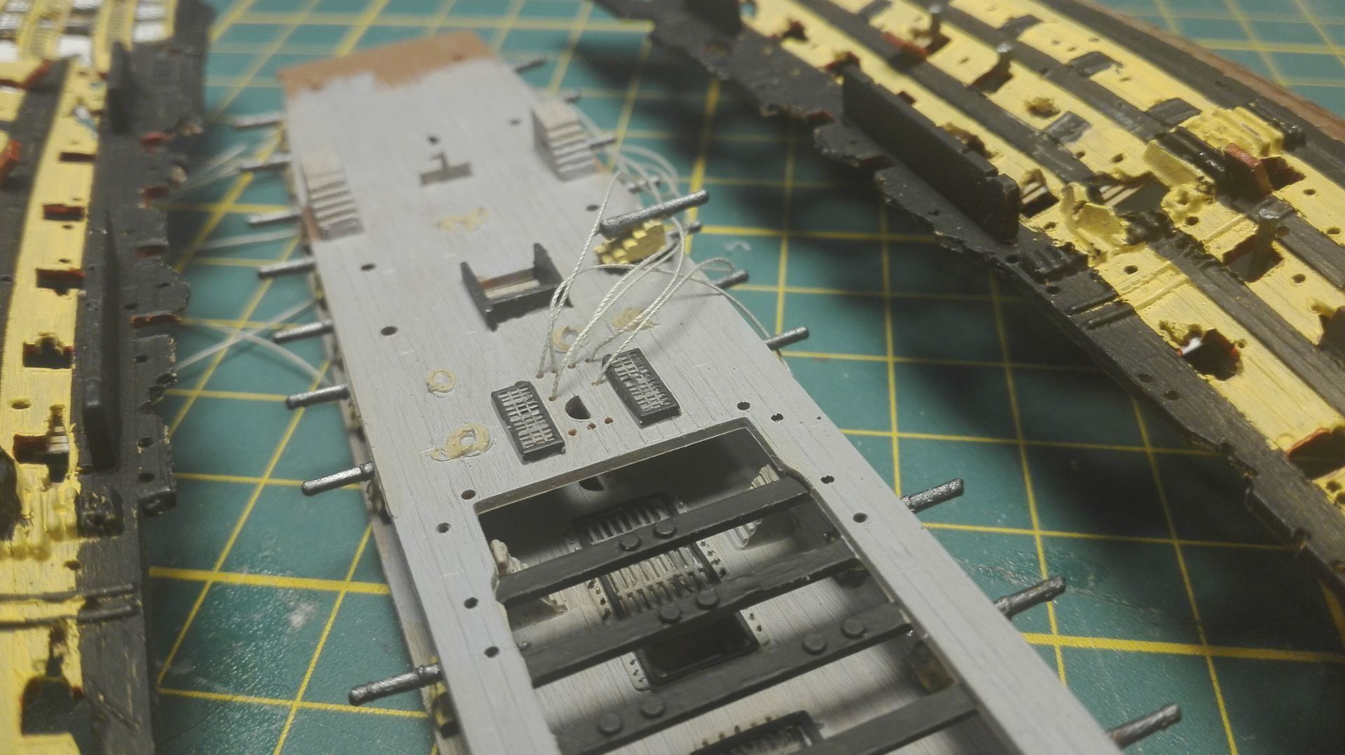 Die Neptune verfügt so über noch vier Boote, der Victory verblieb nur der Kutter. Bevor bei der Neptune Rumpf- und Decksteile zusammengefügt wurden, verzurrte ich die Boote auf den Decksbalken über der Kuhl.