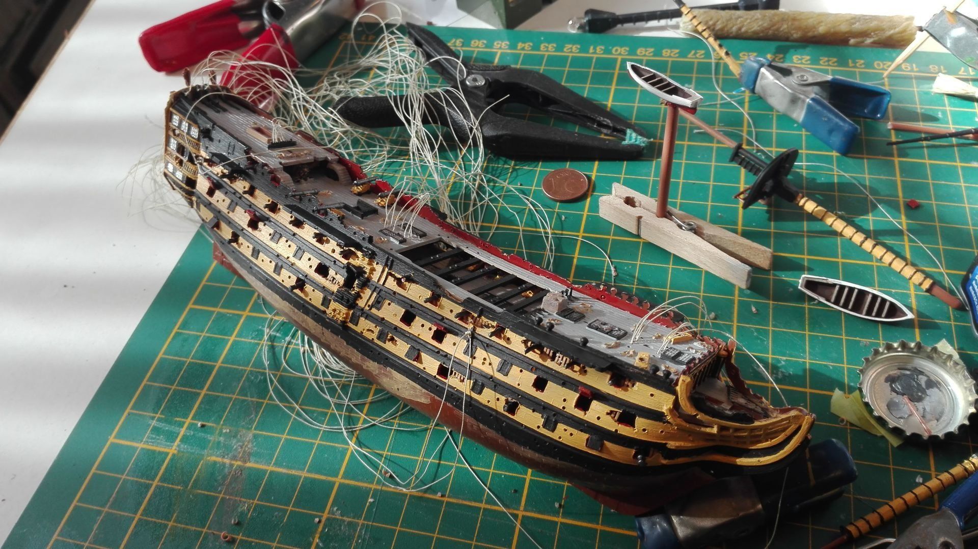 Schratsegel sind keine weiteren erwähnt, weder im Bericht noch auf dem Gemälde dargestellt. Die durchhängenden Schoten und Halsen der Untersegel stellte ich aus sehr dünnem Lötdraht her (MaKo sei Dank), der sich nach dem Abwaschen mit Aceton gut bemalen und kleben ließ. Auch die Fahne am Vormast wurde an diesem Draht gehisst, die Flagge achtern ist an einer Stecknadel als Flaggstock befestigt. Mit dem Aufriggen der Toppnanten waren die Arbeiten in der Takelage der Victory abgeschlossen.