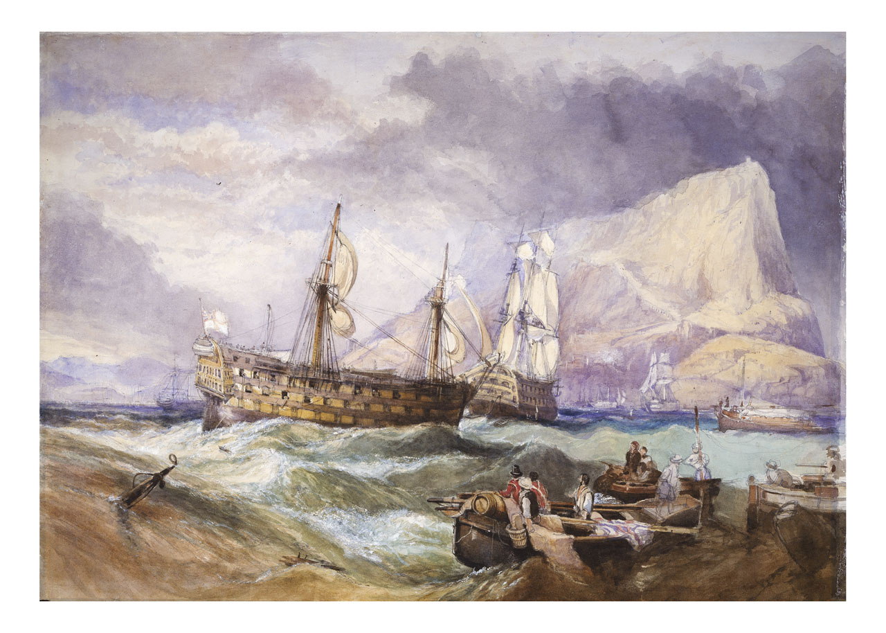 Rechts der Victory fährt die von achtern zu sehende HMS Neptune, beide Schiffe durch eine Schlepptrosse verbunden. Den Hintergrund bildet neben dramatischen Wolkengebilden der „Affenfelsen“ von Gibraltar. Auf der Reede vor dem Felsen sind weitere Kriegsschiffe zu sehen. Im Vordergrund befindet sich eine Flottille kleinerer Boote, auf Zweien sind deutlich britische Marinesoldaten zu erkennen – also Marineboote mit einer unbekannten Aufgabe. Zwei weitere Boote sind besegelt, von Form der Rümpfe und der Takelage her scheinen es einheimische, vielleicht sogar nordafrikanische Fischer oder Händler zu sein. Im Wasser treiben neben einer (Fahrwasser-)Tonne weitere Wrackteile. Ob Stanfield mit diesen Wrackteilen auf die Schlacht anspielt, ist mir unklar. Diese ist sechs oder sieben Tage her und fand in etwa 60 Seemeilen Entfernung statt. Ob Wrackteile in dieser Zeit so weit treiben können, bezweifle ich.