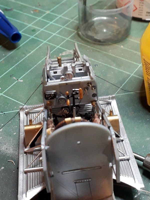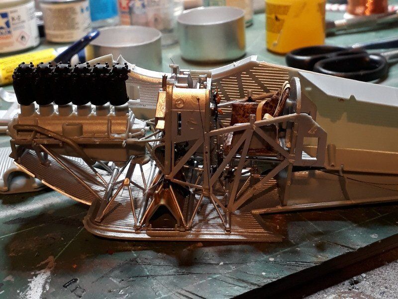 Der Motor wurde gemäß Bauanleitung lackiert und in den Rahmen verbaut. Den Propeller grundierte ich wie gewohnt in der Farbe Revell Nr. 88 Ocker. Die Maserung wurde mit Buntstiften in verschiedenen Brauntönen aufgetragen.
