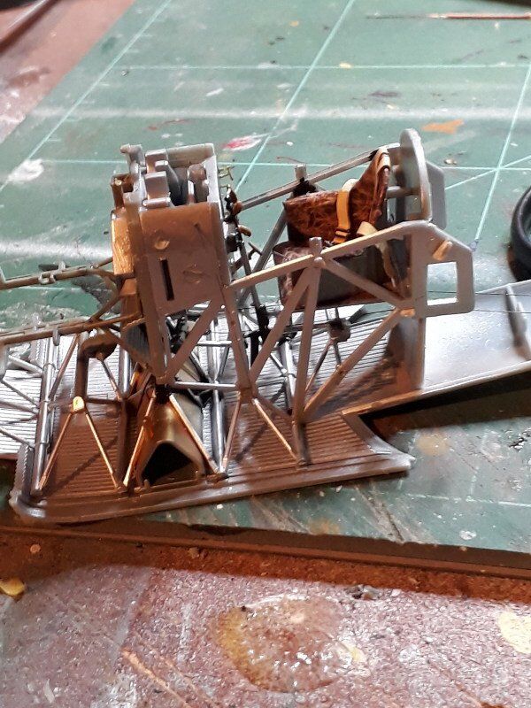 Auch hier hatte ich wieder die Qual der Wahl. Meine Wahl fiel auf die Variante "B" mit der Werks Nr.5185/18 "Bänder" Hombeek, MFJG, November 1918. Nach dem genauen Studieren der Bauanleitung begann ich, wie bei den Fokker-Flugzeugen, auch bei dieser Junkers mit dem inneren Rahmen und dem Interieur. Die Schwierigkeit dieses Bausatzes war hier, dass das untere Rahmengestell als ein Teil mit dem Tank gegossen wurde. Das erschwerte das Lackieren des Gestells erheblich. Ansonsten besticht der Bausatz durch seine gute Passgenauigkeit. Der Pilotensitz wurde auch hier von mir, wie bei den vorigen gebauten Wingnut Modellen, mit Bonbonpapier bespannt. Als besonders dafür geeignet stellte sich das braune Papier von den 'Storck Riesen' heraus, nachdem man die oberste Lage abgepiddelt hat.
