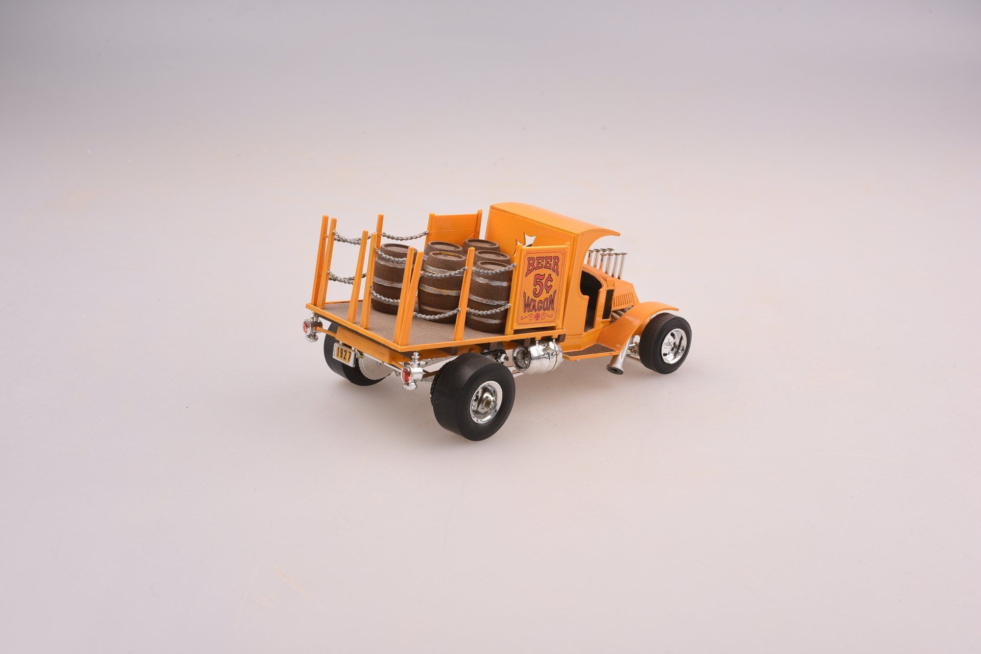 Der Beer Wagon ist die mod Rod Version eines Mack Bulldog aus den zwanziger Jahren. Der Wagen ist mit den damals neusten Hot Rod Features ausgestattet. Die Form des alten Bulldog beibehaltend baute Daniels eine Fiberglaskarosse um ein V8 Cobra Triebwerk mit Kraftübertragung via Kette (!) auf die Hinterachse. Die Vorderachse ist extrem tiefergelegt, auf der Hinterache scheinbar Good Year Walzen statt Reifen aufgezogen. Aus der Motorhaube ragen acht gigantische Saugrohre, die Abgase werden aus einem ebenso riesigem Rohr beiderseits wieder herausgeblasen. Neben jeder Menge Chromteile endet der Schaltstock in einem bavarian Beerseidel, über der Mittelkonsole ist ein Holzfass mit Zapfhahn, darunter zwei Standmulden für Bierseidel, die Sitze mit Kopfstützen sind aus abgesteppten Naughahyde, ein Kunstleder oder auch „pleather“ für plastic leather. Das Rückfenster ist ein ausgeschnittenes Malteserkreuz. Die Bremslichter sind in verchromten, alten Eisenbahnlaternen eingebaut. Die hölzerne Ladefläche über den verchromten Benzintanks ist mit Rungen und verchromten Ketten eingefasst. Insgesamt ein kleines Juwel unter den Automodellen. Und als Original sicherlich auch ein Zuckerstückchen.