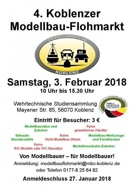 Am 02. Februar 2019 fand in der bekannten Wehrtechnischen Studiensammlung der Bundeswehr (WTS) in Koblenz wieder ein vom MBC-Koblenz organisierter Modellbauflohmarkt statt. Der Einladung des MBC Koblenz waren fast 60 Modellbauer gefolgt, die etwa 119 laufende Meter mit Modellbauartikeln aller Art bestückten.