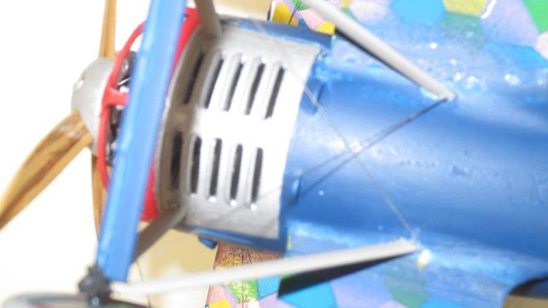 Nach dem Zusammenbau lackierte ich den Motor mit Aluminiumfarbe, die Zylinder mit der Farbe `Burnt Iron‘ von Gunze. Die Ventilstöße erhielten einen silbernen Anstrich. Abschließend bekam der Motor ein Washing aus Braun- und Schwarztönen, inklusive eines leichten Anstrichs mit Gunze Oil. Den Propeller grundierte ich mit der bewährten Farbe ´Ocker 88´ von Revel. Das Finish des Propellers erledigte ich durch eine Laminierung mit Buntstiften, welche ich inzwischen aus dem ‚FF‘ beherrsche (Bild 2 und 3).