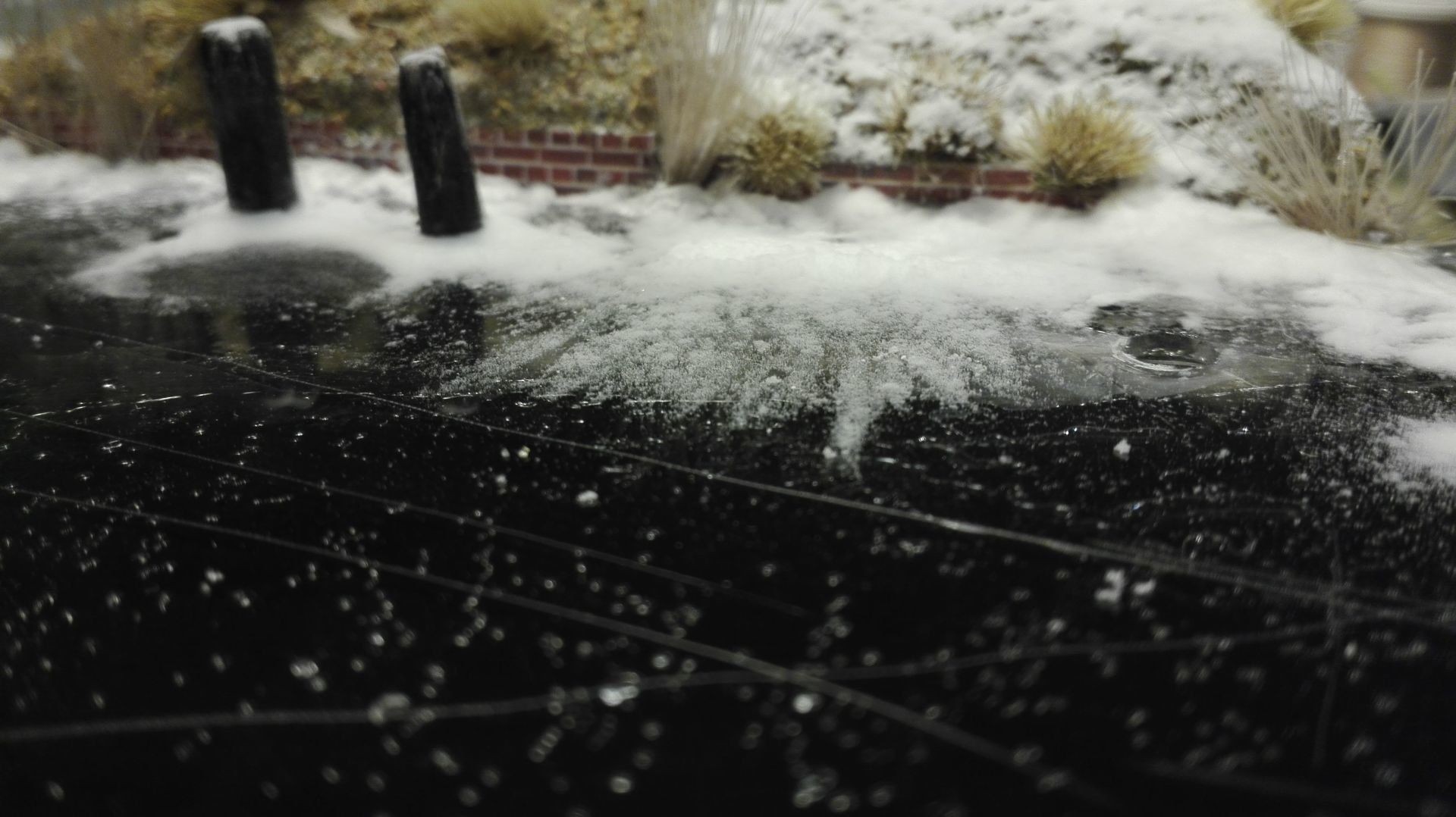 Die Dioramaplatte selbst war denkbar einfach. Ein Holzbrett mit profilierter Kante wurde mehrfach schwarz gestrichen, fein geschliffen und dann mit einer 2mm starken Bastlerglasplatte (Acryl) beklebt (Bild 17). In einer Ecke baute ich einen kleinen Deichfuß ein, mit Backsteinen an der Uferkante, nach hinten mit einem Holzrahmen gesichert (Bild 18). Diese Ecke füllte ich grob mit Styrofoam auf, belegte diesen mit weissleimgetränktem Klopapier und gestaltete mit AK-Microballoons, Terrain-Snow und bräunlichem Gras den winterlichen Deich. Vor dem Deich stecken zwei Dalben im Eis (Bild 17).