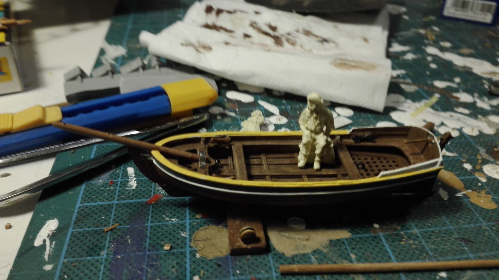 Die Idee, das gesamte Sujet nachzubauen war nicht sofort da, sondern wuchs Stück um Stück. Nach Durchsicht meines Figurenfundus reifte der Entschluss, nicht nur die Bootsbesatzung einzusetzen sondern auch zumindest einen Teil der Menschen auf der Zeichnung darzustellen: Im Vordergrund sind Vater und Sohn dabei ein Loch in das Eis zu schlagen um darin zu angeln.