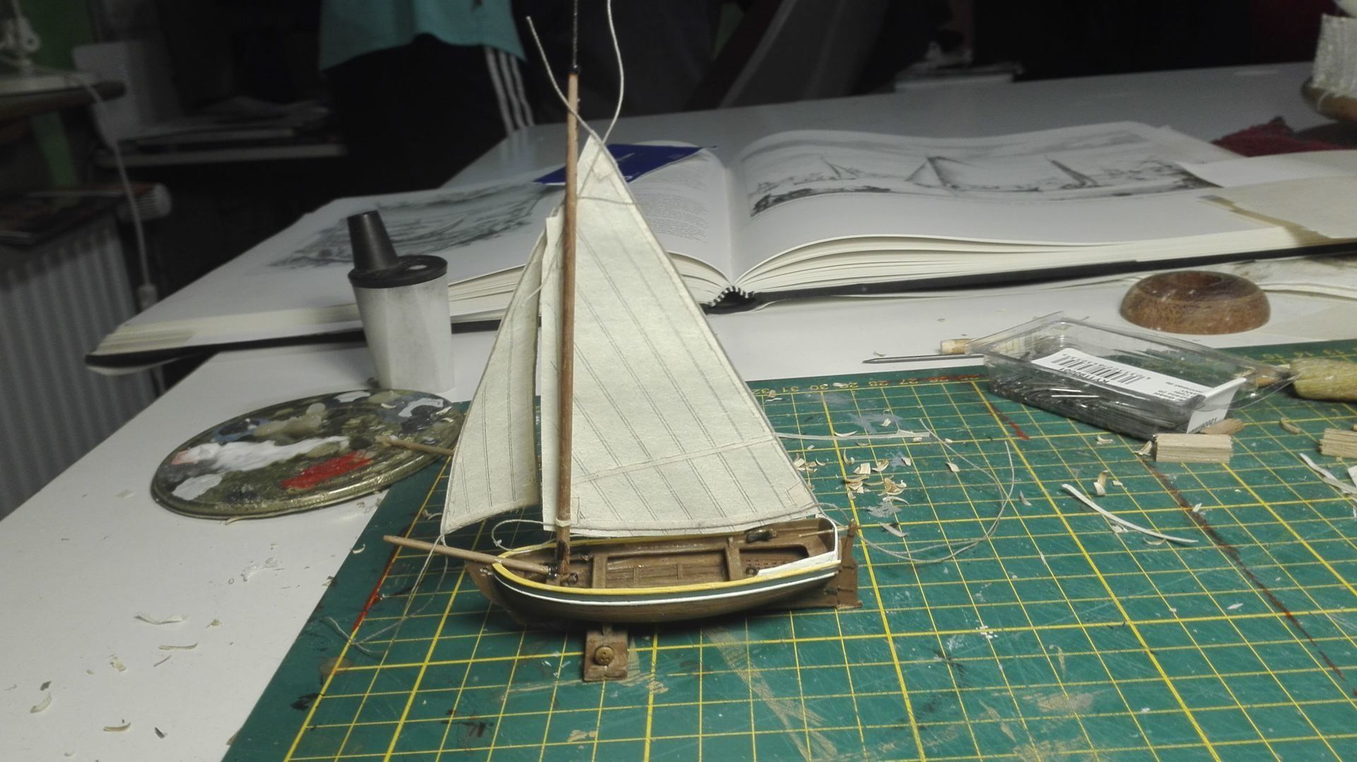 Nachdem die Leimungen getrocknet waren konnte ich die Gatchen (Löcher) für die Segelbefestigung durchstechen. An der kurzen Gaffel ist das Segel mit Marlschlag gebunden, am Mast mit einer einfachen Reihleine. Nach Fertigstellung werden die Segel nass gemacht und mit Stecknadeln auf einem Styrofoamblock in Form gebogen und langsam getrocknet (Bild 9). Die Takelung der Ysschuitje ist insgesamt recht einfach gehalten, allein, damit nicht viel Personal benötigt wird. Das Focksegel ist auch mit einer Reihleine an dem einzigen Stagtau befestigt, so ist für beide Segel ein leichtes auf- und niederholen gewährleistet (Bild 10). Diese Informationen sind in alle dem vorliegenden Bild enthalten. Die Takelung besteht somit nur aus Fallen, Niederholern, Schoten, Halsen, der Gaffeldirk, Piekfall und zwei Stagen und zwei Wanten. Ob die Schuitje noch einen Klüver fuhr ist unklar, auf der Zeichnung ist keiner zu sehen (Bild 11).